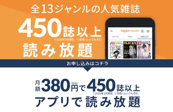 楽天マガジンはその名の通り、楽天が運営する「雑誌読み放題サービス」です。最初に登録した頃は200誌が読み放題になっていましたが…現在は「450誌以上が読み放題」になっています。