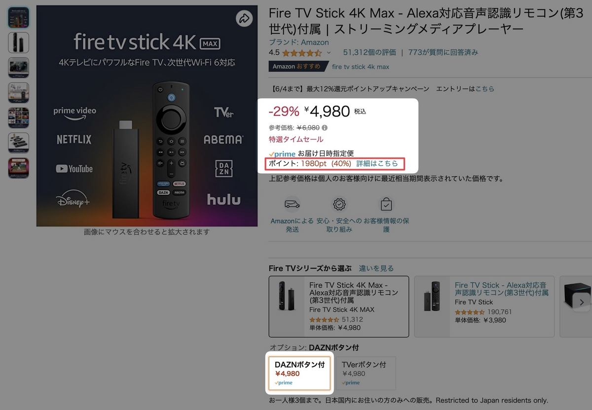 毎回Amazonセールで激安になるFire TV シリーズですが…特に注目したいのが「Fire TV Stick 4K Max:DAZNボタンモデル」です。29%オフの4,980円でかなり安くなっていますが、さらにAmazonポイントが1980円分になっています!(※ポイントアップは終了したようです)